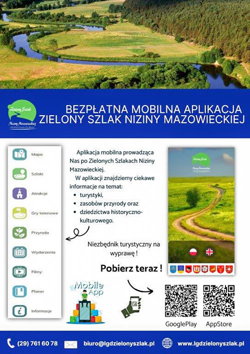 Zachęcamy Państwa do pobrania bezpłatnej aplikacji na telefony komórkowe "Zielony Szlak" to aplikacja, która wiedzie nas po najciekawszych zakątkach Zielonego Szlaku Niziny Mazowieckiej. W aplikacji znajdziecie informacje na temat turystyki, zasobów przyrody oraz dziedzictwa historyczno-przyrodniczego naszego obszaru.